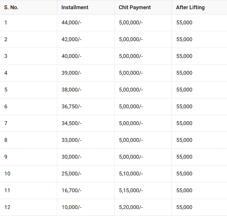 Introducing our 5 Lakh Chit Scheme – a structured savings plan that adapts to your financial journey. With affordable monthly installments starting at ₹44,000 and gradually reducing to ₹10,000, this scheme ensures a manageable pathway to your ₹5,00,000 goal. Perfectly designed for flexibility and accessibility, the 5 Lakh Chit Fund allows you to meet your financial objectives with ease and security. Join us to experience a smarter, more reliable way to grow your savings.